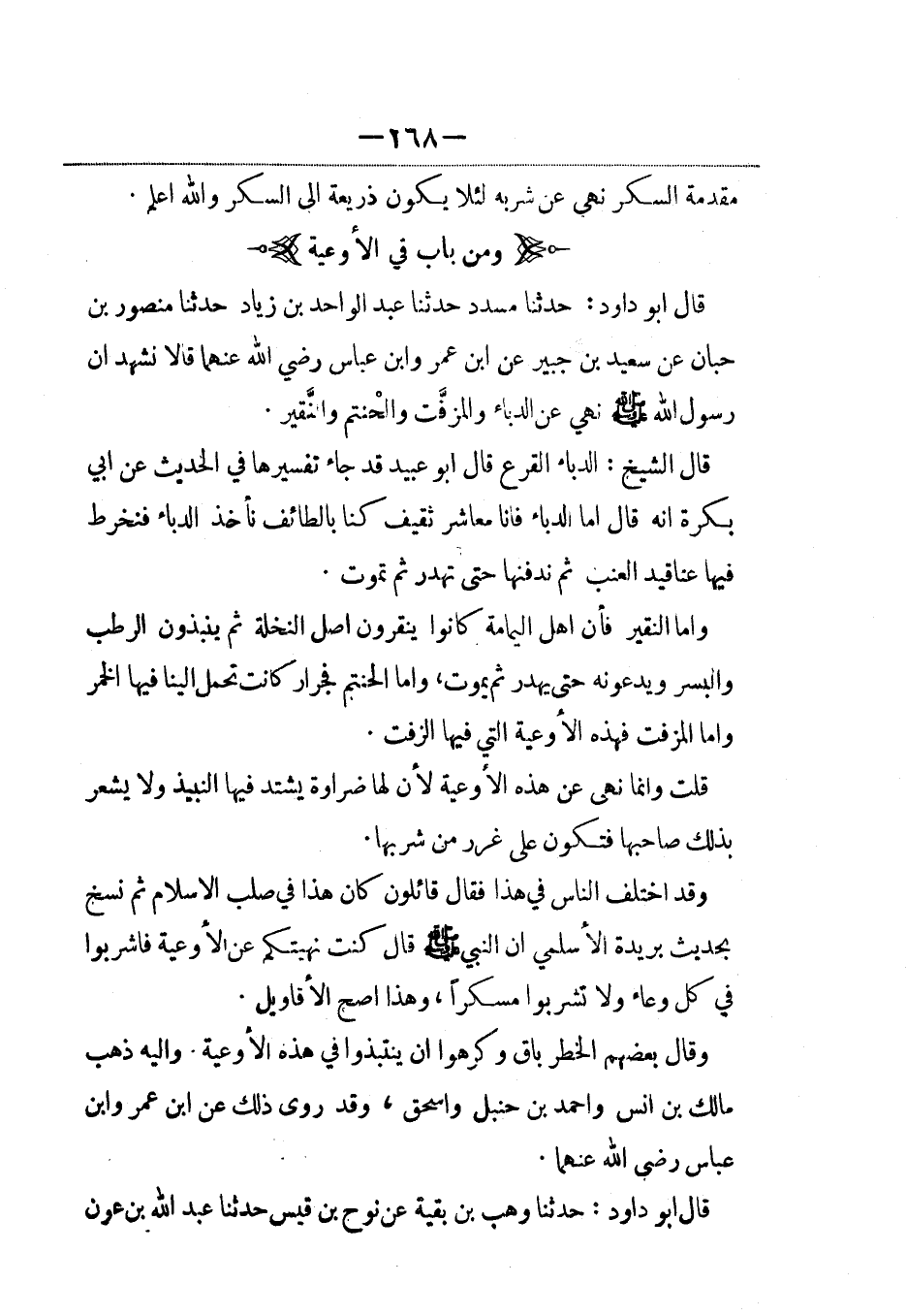قال أبو داود: حدثنا مسدد حدثنا عبد الواحد بن زياد حدثنا منصور بن حبان عن سعيد بن جبير عن ابن عمر وابن عباس رضي الله عنهما قالا نشهد أن رسول الله صلى الله عليه وسلم نهى عن الدباء والمزفَّت والحنتم والنَّقير.