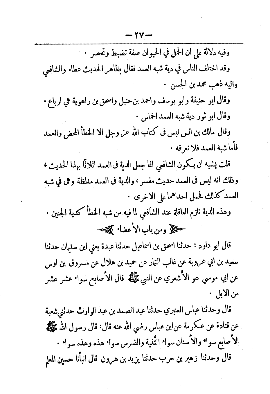 قال أبو داود: حدثنا إسحاق بن إسماعيل حدثنا عبدة، يَعني ابن سليمان حدثنا سعيد بن أبي عروبة عن غالب التمار عن حميد بن هلال عن مسروق بن أوس، عَن أبي موسى هو الأشعري عن النبي صلى الله عليه وسلم قال الأصابع سواء عشر عشر من الإبل.