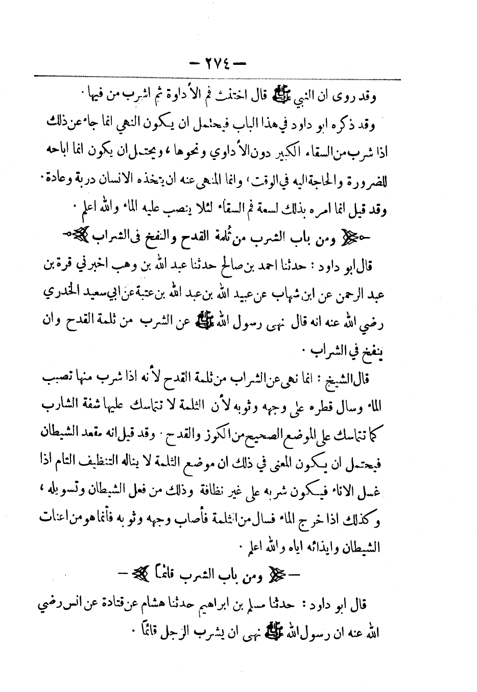 قال أبو داود: حدثنا مسلم بن إبراهيم حدثنا هشام عن قتادة عن أنس رضي الله عنه أن رسول الله صلى الله عليه وسلم نهى أن يشرب الرجل قائماً.