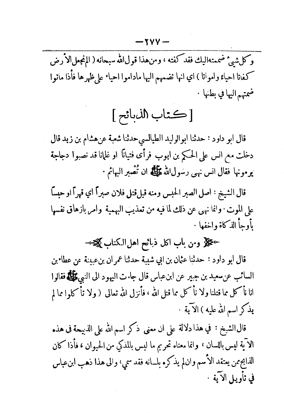 قال أبو داود: حدثنا أبو الوليد الطيالسي حدثنا شعبة عن هشام بن زيد قال دخلت مع أنس على الحكم بن أيوب فرأى فتياناً أو غلماناً قد نصبوا دجاجة يرمونها فقال أنس نهى رسول الله صلى الله عليه وسلم أن تُصْبر البهائم.