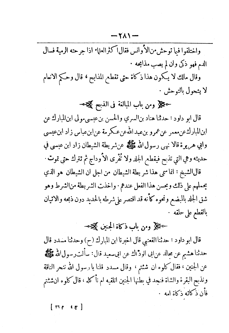 قال أبو داود: حدثنا هناد بن السري والحسن بن عيسى مولى ابن المبارك عن ابن المبارك عن معمر عن عمرو بن عبد الله عن عكرمة عن ابن عباس زاد ابن عيسى وأبي هريرة قالا نهى رسول الله صلى الله عليه وسلم عن شريطة الشيطان زاد ابن عيسى في حديثه وهي التي تذبح فيقطع الجلد ولا تُفْرى الأوداج ثم تترك حتى تموت.