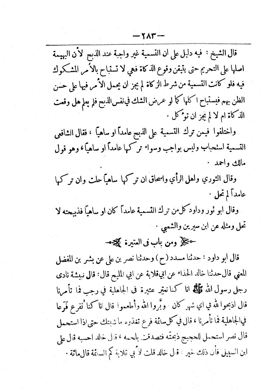 قال أبو داود: حدثنا مسدد (ح) وحدثنا نصر بن علي عن بشر بن المفضل المعنى، قال: حَدَّثنا خالد الحذاء، عَن أبي قلابة، عَن أبي المليح قال: قال بيشة نادى رجل رسول الله صلى الله عليه وسلم إنا كنا نعتر عتيرة في الجاهلية في رجب فما تأمرنا قال: اذبحوا لله في أي شهر كان وبَّروا الله وأطعموا قال إنا كنا نُفرع فَزَعاً في الجاهلية فما تأمرنا، قال في كل سائمة فرع تغذوه ماشيتك حتى إذا استحمل قال نصر استحمل للحجيج ذبحته فتصدقت بلحمه، قال خالد احسبه قال على ابن السبيل فإن ذلك خير، قال خالد قلت لأبي قلابة كم السائمة قال مائة.