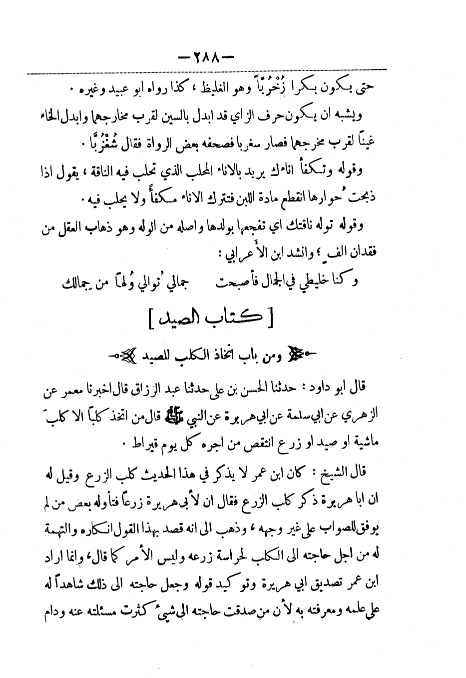 قال الشيخ: كان ابن عمر لا يذكر في هذا الحديث كلب الزرع وقيل له إن أبا هريرة ذكر كلب الزرع فقال إن لأبي هريرة زرعاً فتأوله بعض من لم يوفق للصواب على غير وجهه، وذهب إلى أنه قصد بهذا القول إنكاره والتهمة له من أجل حاجته إلى الكلب لحراسة زرعه وليس الأمر كما قال، وإنما أراد ابن عمر تصديق أبي هريرة وتوكيد قوله وجعل حاجته إلى ذلك شاهداً له على علمه ومعرفته به لأن من صدقت حاجته إلى شيء كثرت مسألته عنه ودام