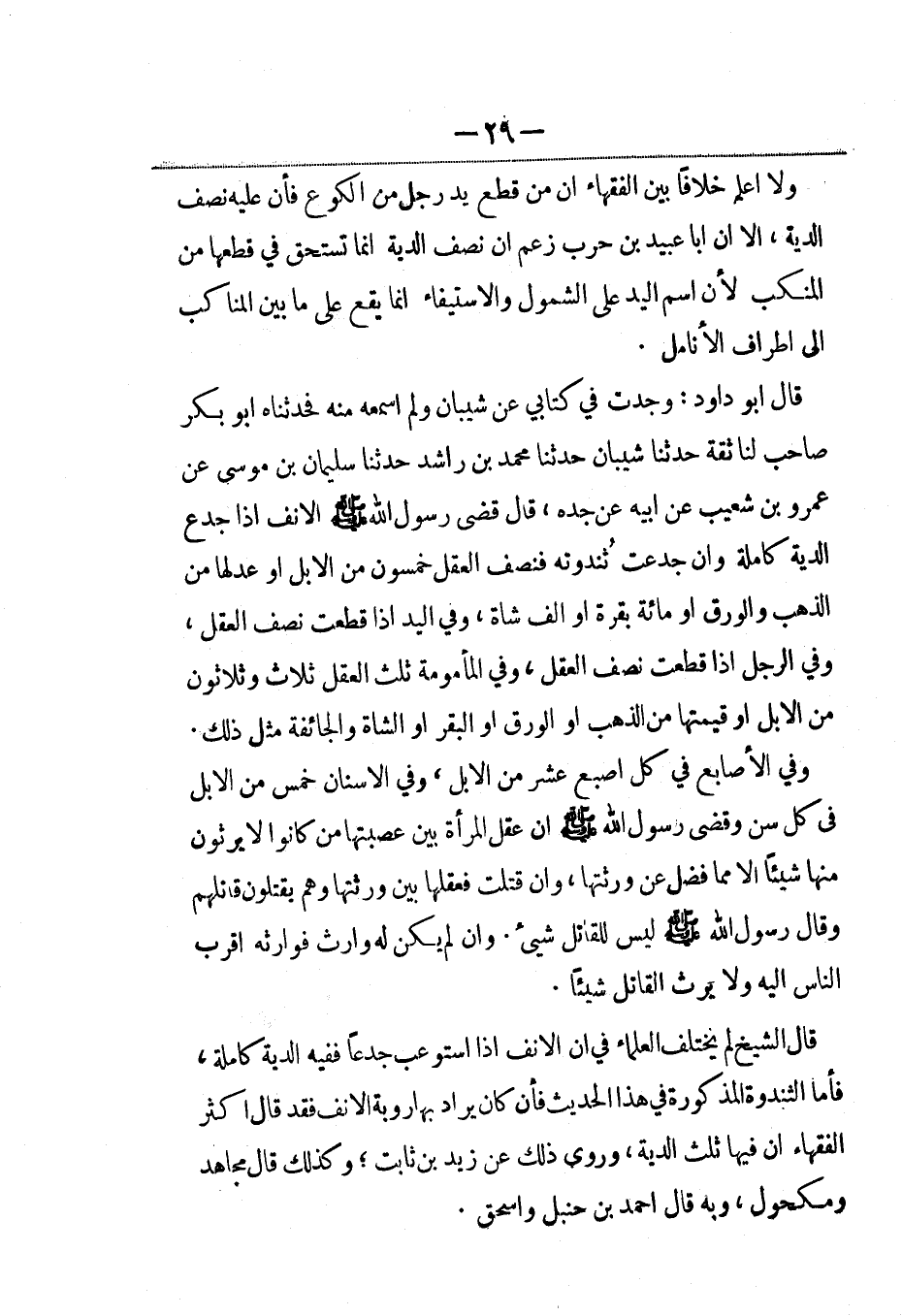 قال أبو داود: وجدت في كتابي عن شيبان ولم أسمعه منه فحدثناه أبو بكر صاحب لنا ثقة حدثنا شيبان حدثنا محمد بن راشد حدثنا سليمان بن موسى عن عمرو بن شعيب عن أبيه عن جده، قال قضى رسول الله صلى الله عليه وسلم الأنف إذا جدع الدية كاملة وإن جدعت ثُندوته فنصف العقل خمسون من الإبل أو عدلها من الذهب والورق أو مائة بقرة أو ألف شاة، وفي اليد إذا قطعت نصف العقل، وفي الرجل إذا قطعت نصف العقل، وفي المأمومة ثلث العقل ثلاث وثلاثون من الإبل أو قيمتها من الذهب أو الورق أو البقر أو الشاة والجائفة مثل ذلك.