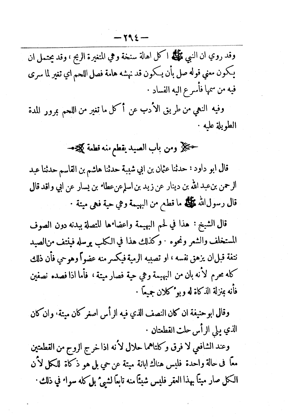 قال أبو داود: حدثنا عثمان بن أبي شيبة حدثنا هاشم بن القاسم حدثنا عبد الرحمن بن عبد الله بن دينار عن زيد بن أسلم عن عطاء بن يسار، عَن أبي واقد قال قال رسول الله صلى الله عليه وسلم: ما قطع من البهيمة وهي حية فهي ميتة.