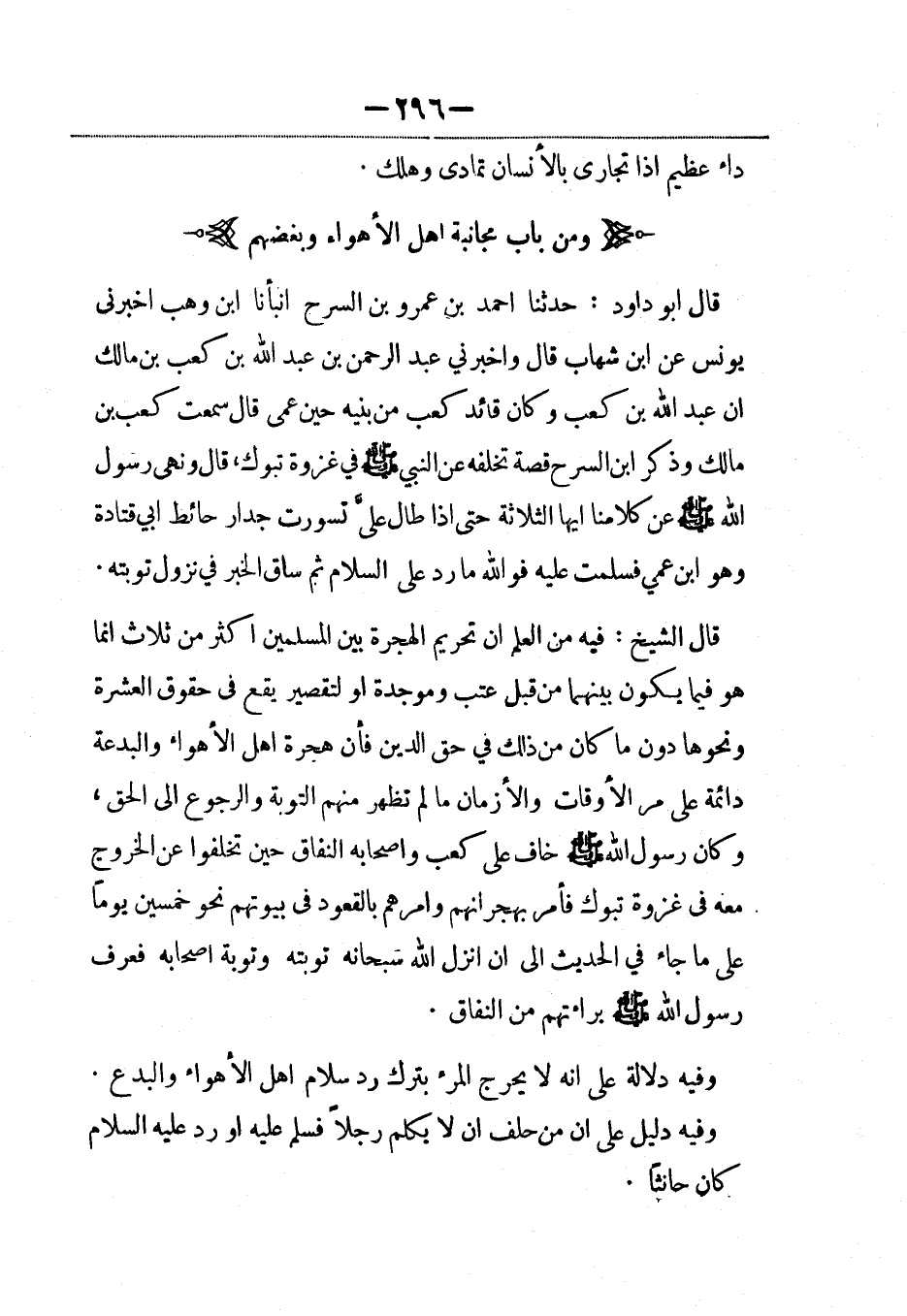 قال الشيخ: فيه من العلم أن تحريم الهجرة بين المسلمين أكثر من ثلاث إنما هو فيما يكون بينهما من قبل عتب وموجدة أو لتقصير يقع في حقوق العشرة ونحوها دون ما كان من ذلك في حق الدين فإن هجرة أهل الأهواء والبدعة دائمة على مر الأوقات والأزمان ما لم تظهر منهم التوبة والرجوع إلى الحق، وكان رسول الله صلى الله عليه وسلم خاف على كعب وأصحابه النفاق حين تخلفوا عن الخروج معه في غزوة تبوك فأمر بهجرانهم وأمرهم بالقعود في بيوتهم نحو خمسين يوماً على ما جاء في الحديث إلى أن أنزل الله سبحانه توبته وتوبة أصحابه فعرف رسول الله صلى الله عليه وسلم براءتهم من النفاق.