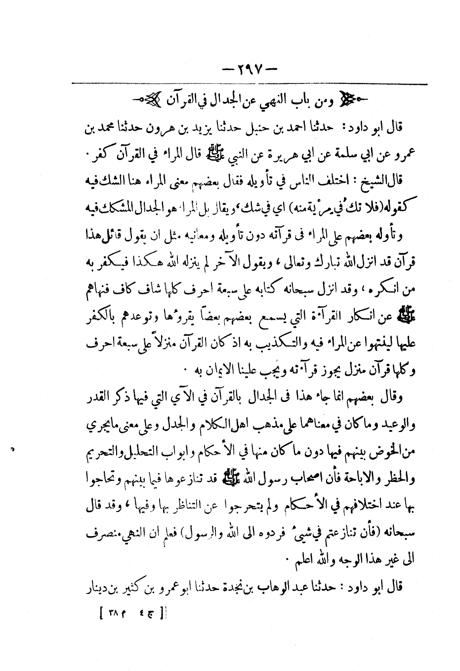 قال أبو داود: حدثنا أحمد بن حنبل حدثنا يزيد بن هارون حدثنا محمد بن عمرو، عَن أبي سلمة، عَن أبي هريرة عن النبي صلى الله عليه وسلم قال: المراء في القرآن كفر.