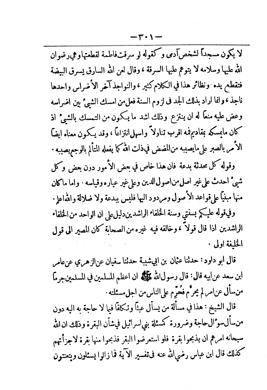 قال أبو داود: حدثنا عثمان بن أبي شييه حدثنا سفيان عن الزهري عن عامر بن سعد عن أيبه قال: قال رسول الله صلى الله عليه وسلم: إن أعظم المسلمين في المسلمين جرماً من سأل عن أمر لم يحرَّم فحُرِّم على الناس من أجل مسألته.