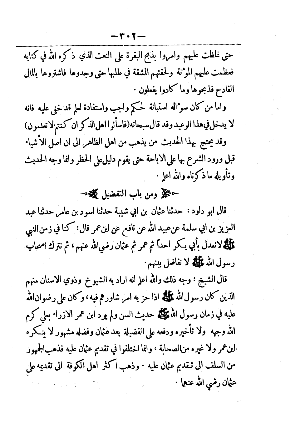 قال أبو داود: حدثنا عثمان بن أبي شيبة حدثنا أسود بن عامر حدثنا عبد العزيز بن أبي سلمة عن عبيد الله عن نافع عن ابن عمر قال: كنا في زمن النبي صلى الله عليه وسلم لا نعدل بأبي بكر أحداً ثم عمر ثم عثمان رضي الله عنهم، ثم نترك أصحاب رسول الله صلى الله عليه وسلم لا نفاضل بينهم.