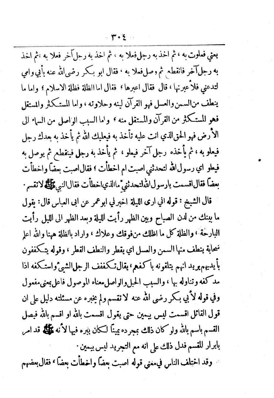 يَعني فعلوت به، ثم أخذ به رجل فعلا به، ثم أخذ به رجل آخر فعلا به، ثم أخذ به رجل آخر فانقطع ثم وصل فعلا به، فقال أبو بكر رضي الله عنه بأبي وأمي لتدعني فلأعبرنها، قال فقال اعبرها؛ فقال أما الظلة فظلة الإسلام؛ وأما ما ينطف من السمن والعسل فهو القرآن لينه وحلاوته، وأما المستكثر والمستقل فهو المستكثر من القرآن والمستقل منه؛ وأما السبب الواصل من السماء إلى الأرض فهو الحق الذي أنت عليه تأخذ به فيعليك الله ثم يأخذ به بعدك رجل فيعلو به، ثم يأخذه رجل آخر فيعلو، ثم يأخذ به رجل فينقطع ثم يوصل به فيعلو أي رسول الله لتحدثني أصبت أم أخطأت؛ فقال أصبت بعضاً وأخطأت بعضا فقال أقسمت يا رسول الله لتحدثني ما الذي أخطأت فقال النبي صلى الله عليه وسلم: لا تقسم.