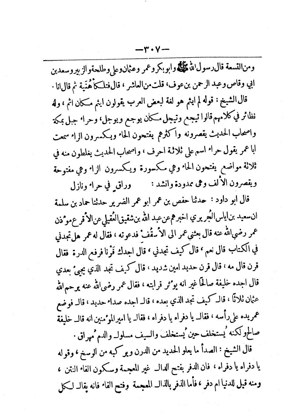 قال أبو داود: حدثنا حفص بن عمر أبو عمر الضرير حدثنا حماد بن سلمة أن سعيد بن إياس الجريري أخبرهم عن عبد الله بن شقيق العُقيلي عن الأقرع مؤذن عمر رضي الله عنه قال بعثني عمر إلى الأسقُف فدعوته، فقال له عمر هل تجدني في الكتاب قال نعم، قال كيف تجدني، قال أجدك قَرْناً فرفع الدرة فقال قرن قال مه، قال قرن حديد أمين شديد، قال كيف تجد الذي يجيء بعدي قال أجده خليفة صالحاً غير أنه يؤثر قرابته، فقال عمر رضي الله عنه يرحم الله عثمان ثلاثاً، قال كيف تجد الذي بعده، قال أجده صداء حديد، قال فوضع عمر يده على رأسه، فقال يا دفراه يا دفراه، فقال يا أمير المؤمنين أنه قال خليفة صالح ولكنه يُستخلف حين يُستخلف والسيف مسلول والدم مُهراق.