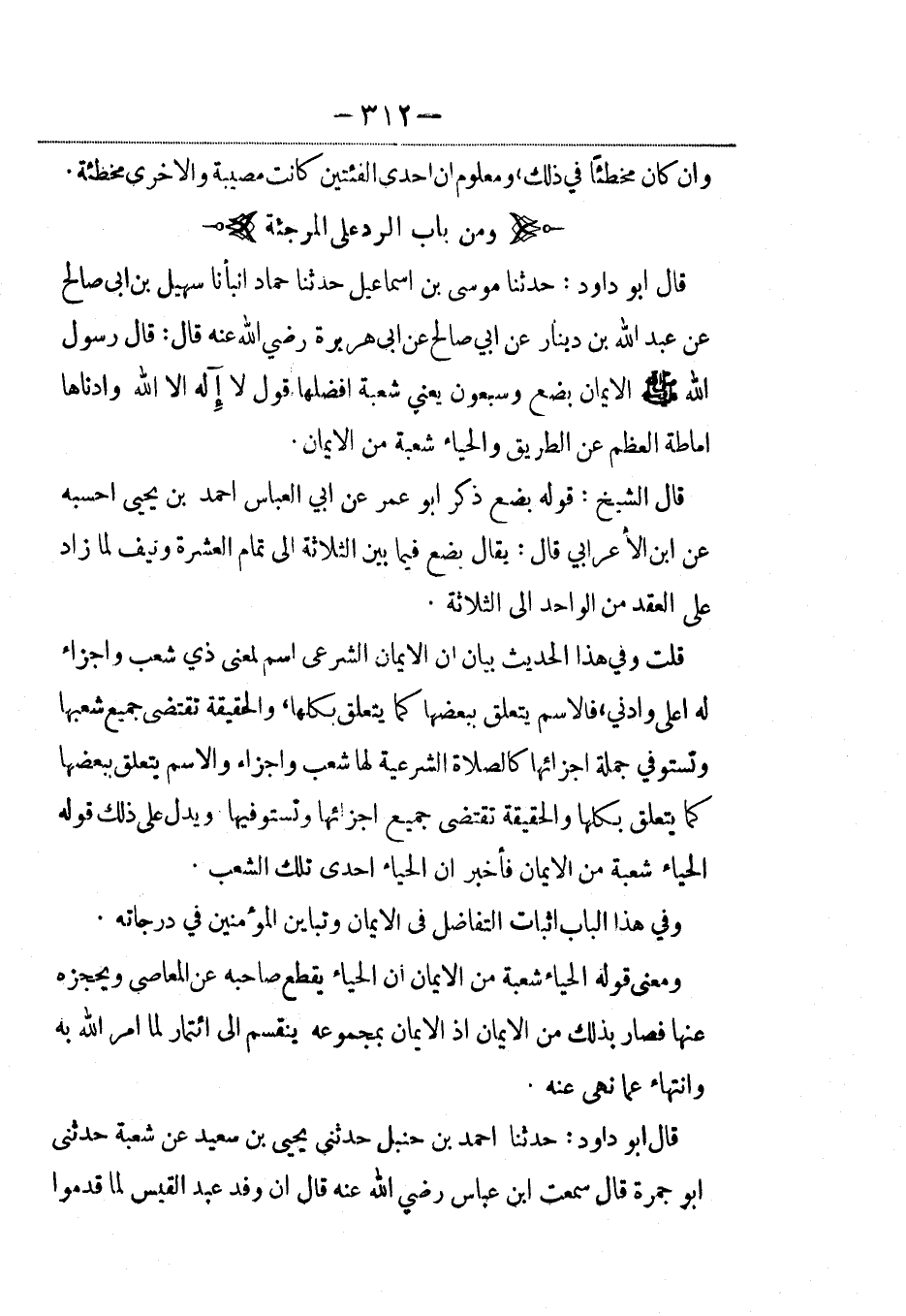 قال أبو داود: حدثنا موسى بن إسماعيل حدثنا حماد أنبأنا سهيل بن أبي صالح عن عبد الله بن دينار، عَن أبي صالح، عَن أبي هريرة رضي الله عنه قال: قال رسول الله صلى الله عليه وسلم: الإيمان بضع وسبعون، يَعني شعبة أفضلها قول لا إله إلاّ الله وأدناها إماطة العظم عن الطريق والحياء شعبة من الإيمان.