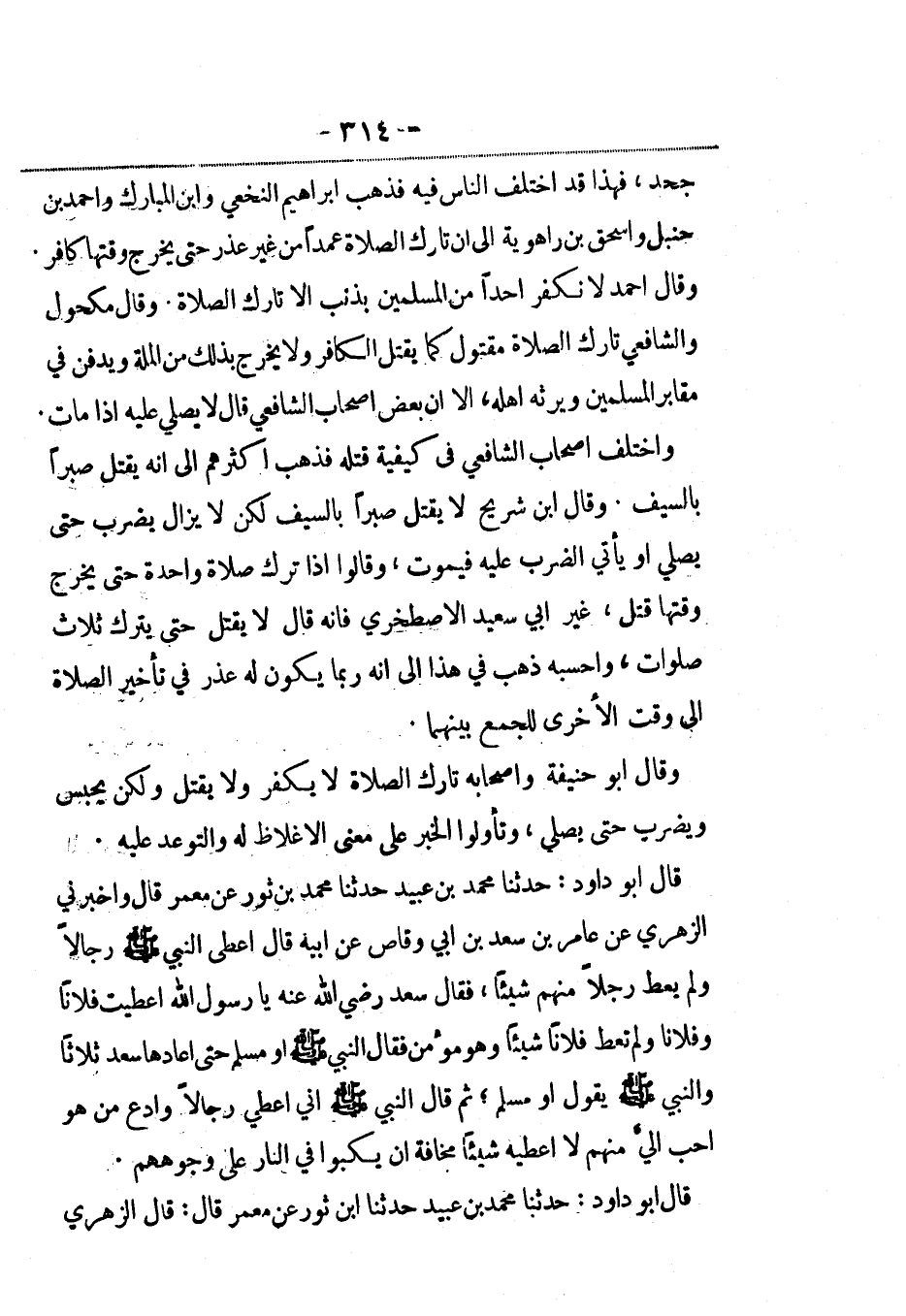 قال أبو داود: حدثنا مححد بن عبيد حدثنا محمد بن ثور عن معمر قال: وأخبرني الزهري عن عامر بن سعد بن أبي وقاص عن أبيه قال أعطى النبي صلى الله عليه وسلم رجالاً ولم يعط رجلاً منهم شيئاً، فقال سعد رضي الله عنه يا رسول الله أعطيت فلاناً وفلاناً ولم تعط فلاناً شيئاً وهو مؤمن فقال النبي صلى الله عليه وسلم أو مسلم حتى أعادها سعد ثلاثاً والنبي صلى الله عليه وسلم يقول أو مسلم، ثم قال النبي صلى الله عليه وسلم: إني أعطي رجالاً وأدع من هو أحب إلي منهم لا أعطيه شيئاً مخافة أن يكبوا في النار على وجوههم.