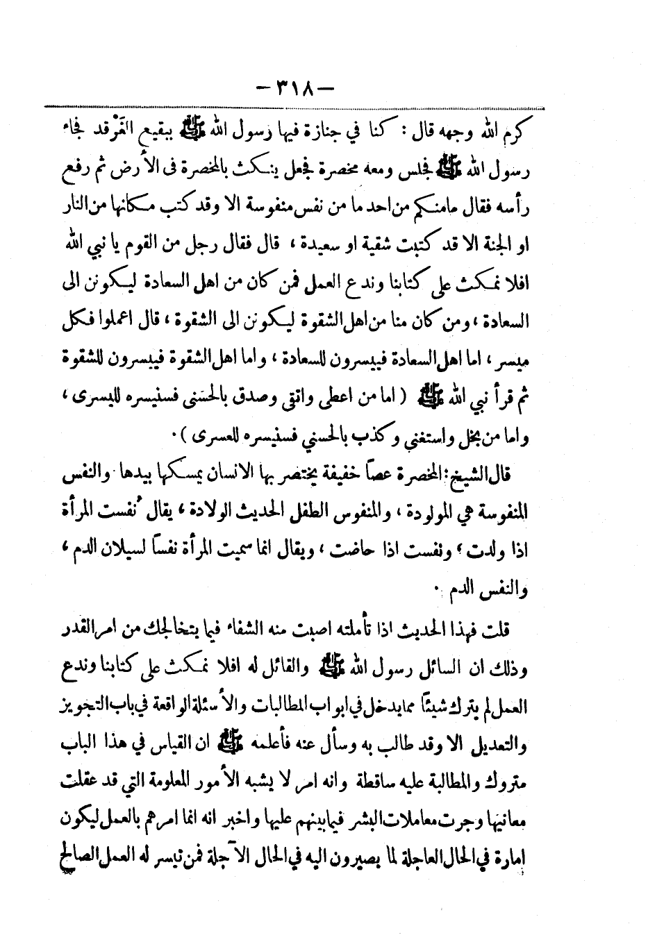 كرم الله وجهه قال: كنا في جنازة فيها رسول الله صلى الله عليه وسلم ببقيع الغَرْقد فجاء رسول الله صلى الله عليه وسلم فجلس ومعه مخصرة فجعل ينكث بالمخصرة في الأرض ثم رفع رأسه فقال ما منكم من أحد ما من نفس منفوسة إلاّ وقد كتب مكانها من النار أو الجنة إلاّ قد كتبت شقية أو سعيدة، قال فقال رجل من القوم يا نبي الله أفلا نمكث على كتابنا وندع العمل فمن كان من أهل السعادة ليكونن إلى السعادة، ومن كان منا من أهل الشقوة ليكونن إلى الشقوة، قال اعملوا فكل ميسر، أما أهل السعادة فييسرون للسعادة، وأما أهل الشقوة فييسرون للشقوة ثم قرأ نبي الله صلى الله عليه وسلم {أما من أعطى واتقى وصدق بالحسنى فسنيسره لليسرى، وأن من بخل واستغنى وكذب بالحسنى فسنيسره للعسرى} [الليل: 5-6-7-8-9-10] .