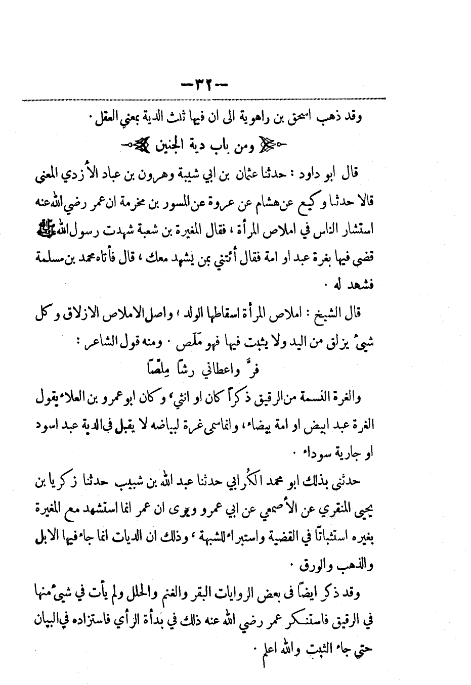 حدثني بذلك أبو محمد الكُرابي حدثنا عبد الله بن شبيب حدثنا زكريا بن يحيى المنقري عن الأصمعي، عَن أبي عمرو ويرى أن عمر إنما استشهد مع المغيرة بغيره استثباتاً في القضية واستبراء للشبهة، وذلك أن الديات إنما جاء فيها الإبل والذهب والورق.