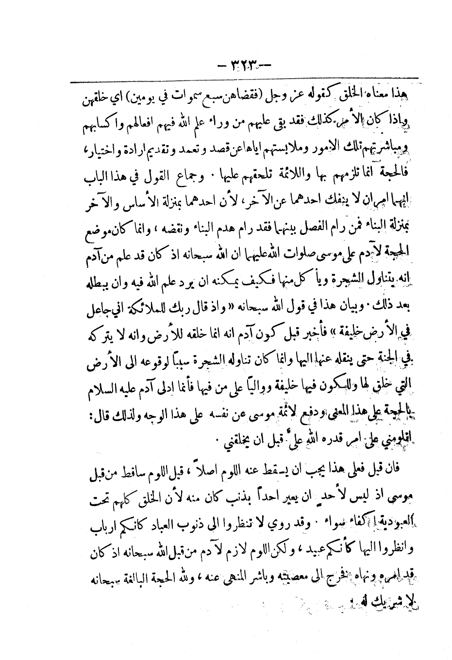 فإن قيل فعلى هذا يجب أن يسقط عنه اللوم أصلاً، قيل اللوم ساقط من قبل موسى إذ ليس لأحد أن يعير أحداً بذنب كان منه لأن الخلق كلهم تحت العبودية أكفاء سواء. وقد روي لا تنظروا إلى ذنوب العباد كأنكم أرباب وانظروا إليها كأنكم عبيد، ولكن اللوم لازم لآدم من قبل الله سبحانه إذ كان قد أمره ونهاه فخرج إلى معصيته وباشر المنهي عنه، ولله الحجة البالغة سبحانه لا شريك له.