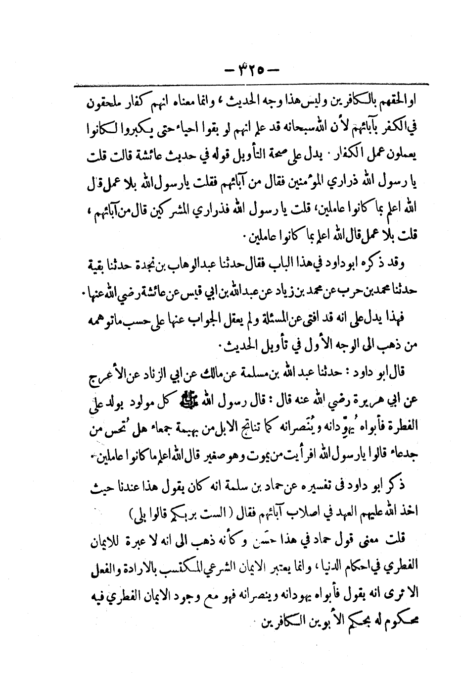 قال أبو داود: حدثنا عبد الله بن مسلمة عن مالك، عَن أبي الزناد عن الأعرج، عَن أبي هريرة رضي الله عنه قال: قال رسول الله صلى الله عليه وسلم كل مولود يولد على الفطرة فأبواه يُهوِّدانه ويُنَصرانه كما تناتج الابل من بهيمة جمعاء هل تُحس من جدعاء. قالوا يا رسول الله أفرأيت من يموت وهو صغير قال الله أعلم ما كانوا عاملين.
