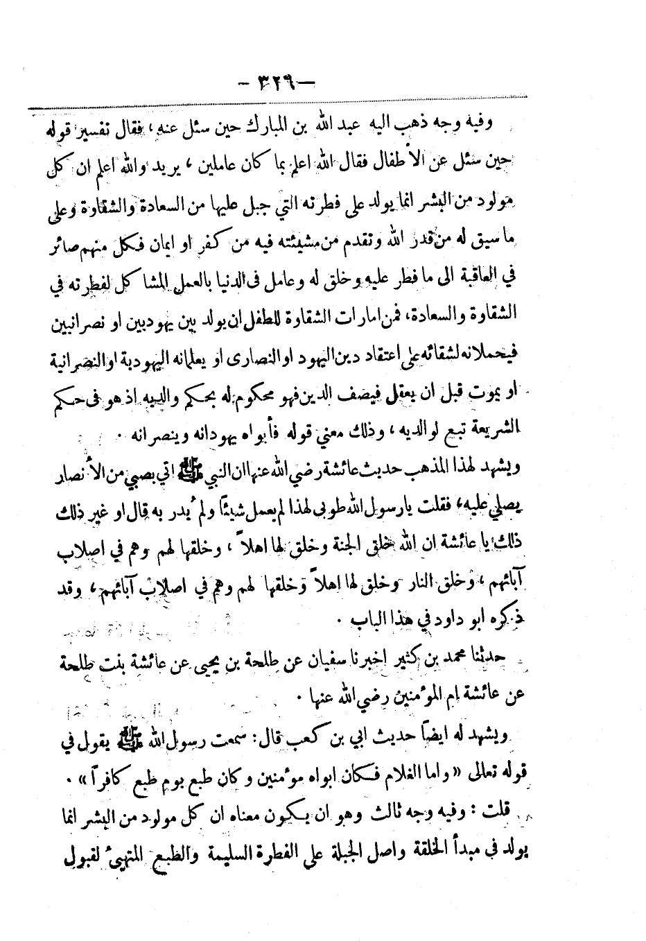 ويشهد لهذا المذهب حديث عائشة رضي الله عنها أن النبي صلى الله عليه وسلم أتي بصبي من الأنصار يصلي عليه، فقلت يا رسول الله طوبى لهذا لم يعمل شيئاً ولم يُدر به قال أو غير ذلك ذلك يا عائشة ان الله خلق الجنة وخلق لها أهلاً، وخلقها لهم وهم في أصلاب آبائهم، وخلق النار وخلق لها أهلاً وخلقها لهم وهم في أصلاب آبائهم، وقد ذكره أبو داود في هذا الباب.