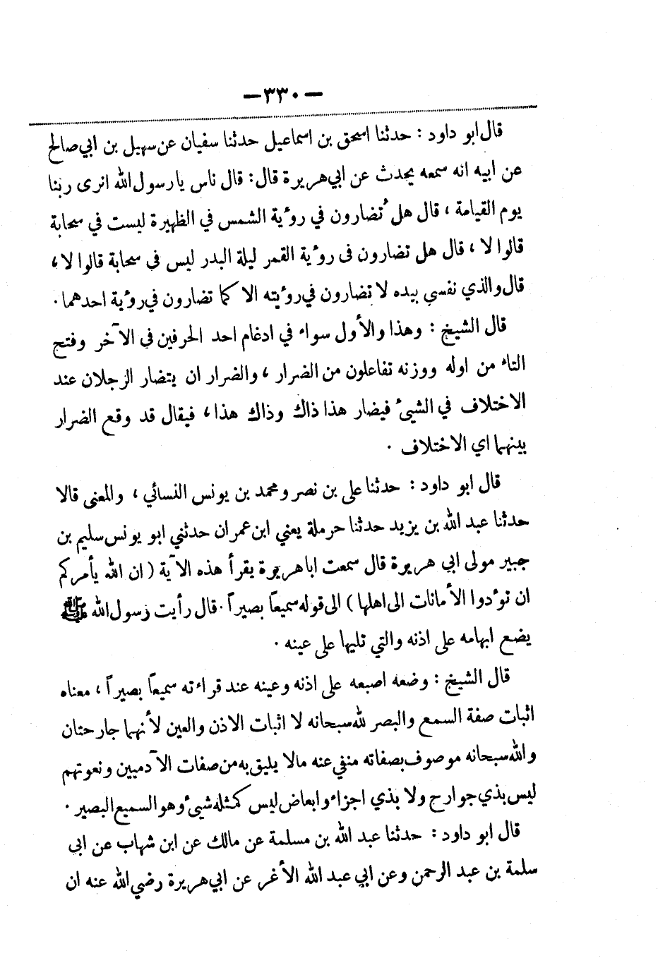 قال أبو داود: حدثنا إسحاق بن إسماعيل حدثنا سفيان عن سهيل بن أبي صالح عن أبيه أنه سمعه يحدث، عَن أبي هريرة قال: قال ناس يا رسول الله أنرى ربنا يوم القيامة، قال هل تُضارون في رؤية الشمس في الظهيرة ليست في سحابة قالوا لا، قال هل تُضارون في رؤية القمر ليلة البدر ليس في سحابة قالوا لا، قال والذي نفسي بيده لا تضارون في رؤيته إلاّ كما تضارون في رؤية أحدهما.