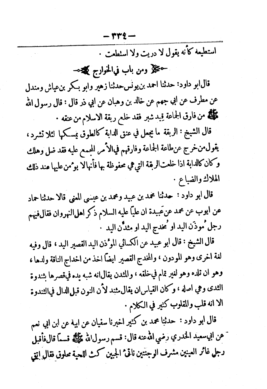 قال أبو داود: حدثنا محمد بن عبيد ومحمد بن عيسى المعنى قالا: حَدَّثنا حماد عن أيوب عن محمد عن عبيدة أن علياً عليه السلام ذكر أهل النهروان فقال فيهم رجل مُوذَن اليد أو مُخدج اليد أو مثدَّن اليد.