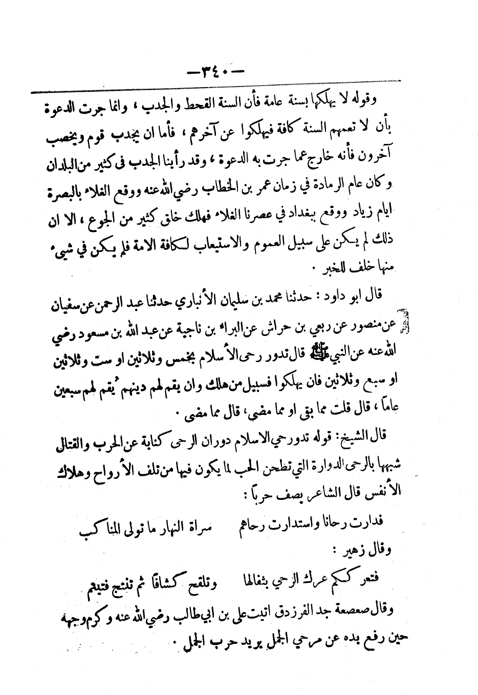 قال أبو داود: حدثنا محمد بن سليمان الأنباري حدثنا عبد الرحمن عن سفيان عن منصور عن ربعي بن حراش عن البراء بن ناجية عن عبد الله بن مسعود رضي الله عنه عن النبي صلى الله عليه وسلم قال تدور رحى الإسلام بخمس وثلاثين أو ست وثلاثين أو سبع وثلاثين فإن يهلكوا فسبيل من هلك وإن يقم لهم دينهم يُقم لهم سبعين عاماً، قال قلت مما بقي أومما مضى قال مما مضى.