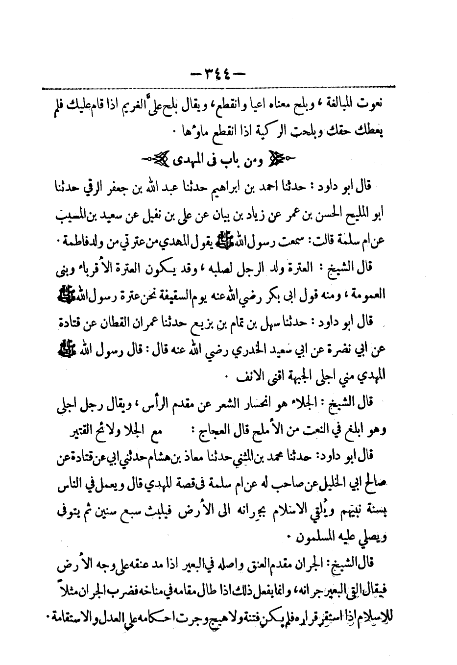 قال أبو داود: حدثنا أحمد بن إبراهيم حدثنا عبد الله بن جعفر الرقي حدثنا أبو المليح الحسن بن عمر عن زياد بن بيان عن علي بن نفيل عن سعيد بن المسيب عن أم سلمة قالت: سمعت رسول الله صلى الله عليه وسلم يقول المهدي من عترتي من ولد فاطمة.