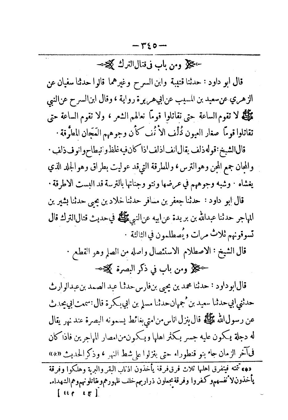 قال أبو داود: حدثنا محمد بن يحيى بن فارس حدثنا عبد الصمد بن عبد الوارث حدثني أبي حدثنا سعيد بن جُمهان حدثنا مسلم بن أبي بكرة قال: سمعت أبي يحدث عن رسول الله صلى الله عليه وسلم قال ينزل أناس من أمتي بغائط يسمونه البصرة عند نهر يقال له دجلة يكون عليه جسر يكثر أهلها ويكون من أمصار المهاجرين فإذا كان في آخر الزمان جاء بنو قنطوراء حتى ينزلوا على شط النهر، وذكر الحديث.