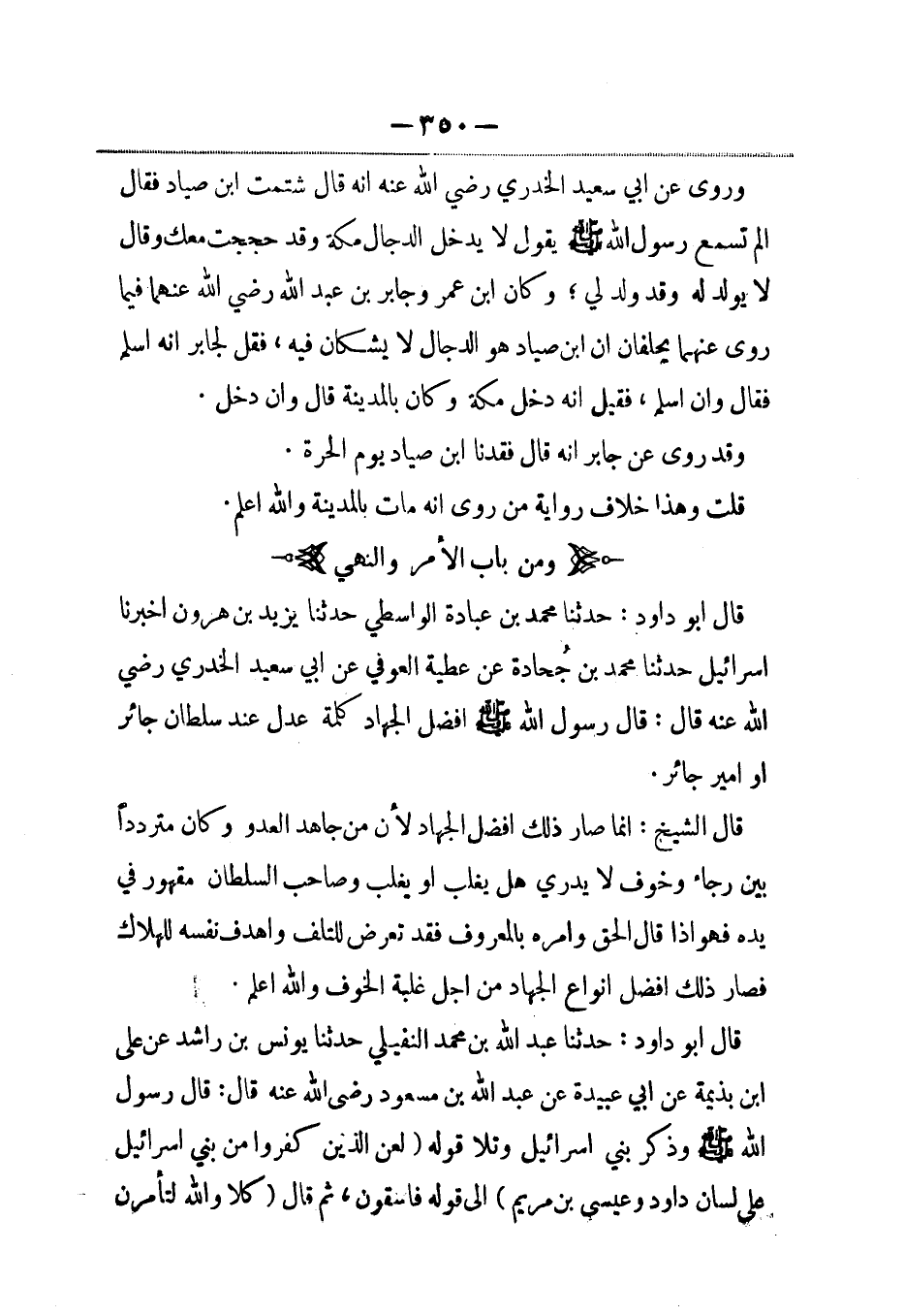قال أبو داود: حدثنا محمد بن عبادة الواسطي حدثنا يزيد بن هارون أخبرنا إسرائيل حدثنا محمد بن جحادة عن عطية العوفي، عَن أبي سعيد الخدري رضي الله عنه قال: قال رسول الله صلى الله عليه وسلم أفضل الجهاد كلمة عدل عند سلطان جائر أو أمير جائر.