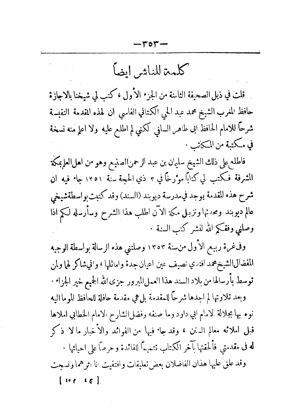 فاطلع على ذلك الشيخ سليمان بن عبد الرحمان الصنيع وهو من أهل العلم بمكة المشرفة فكتب لي كتابا مؤرخا في 3 ذي الحجة 1351 جاء فيه أن شرح هذه المقدمة يوجد في مدرسة ديوبند (السند) وقد كتبت بواسطة شيخي عالم ديوبند ومحدثها ونزيل مكة الآن اطلب هذا الشرح وسأرسله لكم إذا وصلني وفقكم الله لنشر كتب السنة.