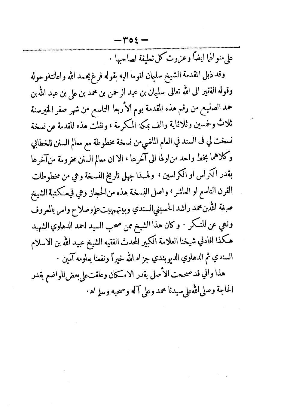 وقد ذيل المقدمة الشيخ سليمان الموما اليه بقوله فرغ بحمد الله واعانته وحوله وقوله الفقير الى الله تعالى سليمان بن عبد الرحمان بن محمد بن علي بن عبد الله بن حمد الصنيع من رقم هذه المقدمة يوم الأربعاء التاسع من شهر صفر الخير سنة ثلاث وخمسين وثلاثماية والف بمكة المكرمة , ونقلت هذه المقدمة عن نسخة نسخت لي في السند في العم الماضي من نسخة مخطوطة مع معالم السنن للخطابي وكلاهما بخط واحد من اولها الى آخرها , الا أن معالم السنن مخرومة من آخرها بقدر الكراس او الكراسين , ولهذا جهل تاريخ النسخة وهي من مخطوطات القرن التاسع أو العاشر , واصل النسخة هذه من الحجاز وهي في مكتبة الشيخ صبغة الله بن محمد بن راشد الحسيني السندي وبيتهم بيت علم وصلاح وامر بالمعروف ونهي عن المنكر. وكان هذا الشيخ ممن صحب السيد احمد الدهلوي الشهيد هكذا افادني شيخنا العلامة الكبير المحدث الفقيه الشيخ عبيد الله بن الاسلام السندي ثم الدهلوي الديوبندي جزاه الله خيرا ونفعنا بعلومه آمين.