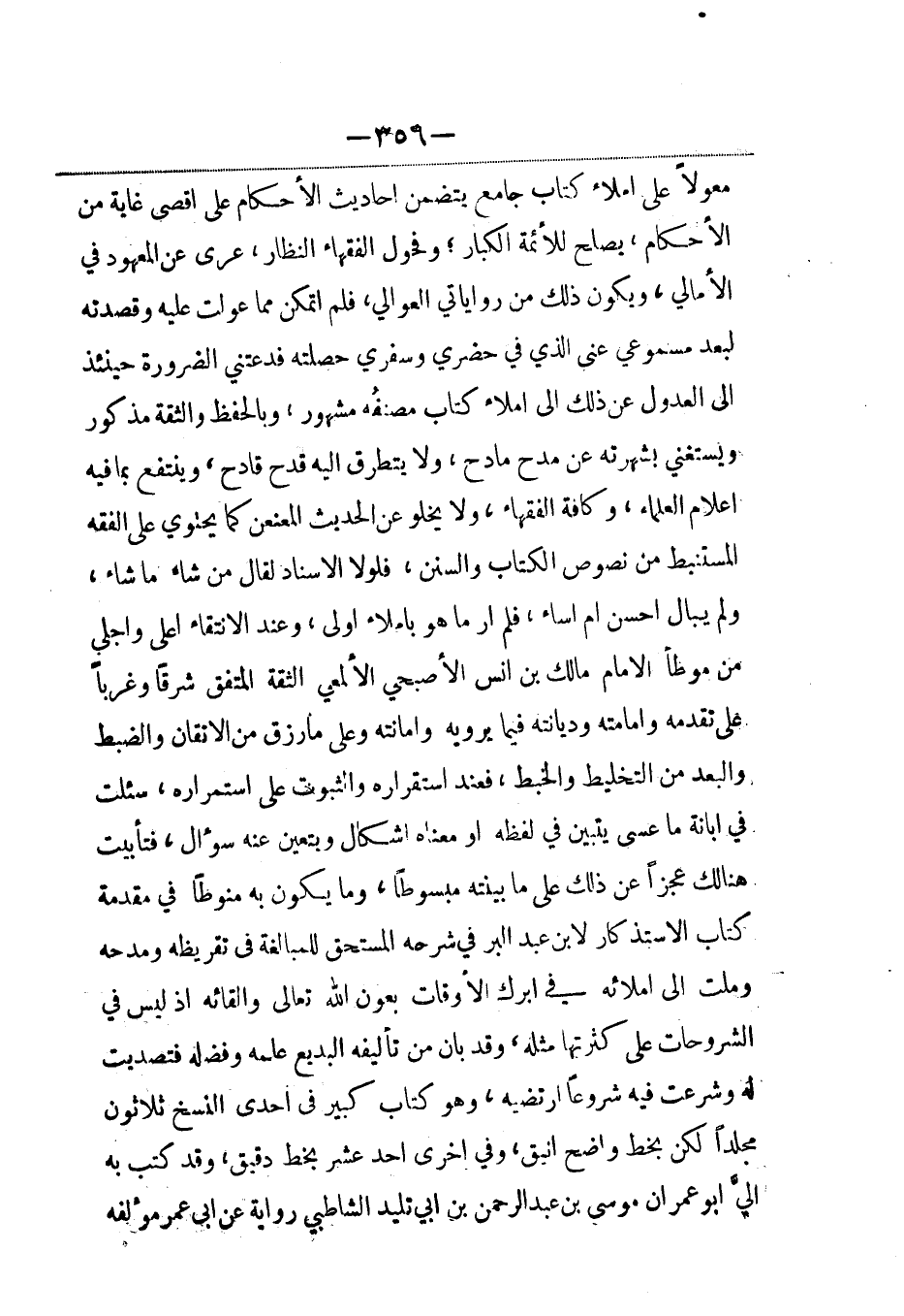معولاً على إملاء كتاب جامع يتضمن أحاديث الأحكام على أقصى غاية من الأحكام، يصلح الأئمة الكبار؛ وفحول الفقهاء النظار، عرى عن المعهود في الأمالي، ويكون ذلك من رواياتي العوالي، فلم أتمكن مما عولت عليه وقصدته لبعد مسموعي عني الذي في حضري وسفري حصلته فدعتني الضرورة حينئذ إلى العدول عن ذلك إلى إملاء كتاب مصنفه مشهور، وبالحفظ والثقة مذكور ويستغني بشهرته عن مدح مادح، ولا يتطرق إليه قدح قادح، وينتفع بما فيه اعلام العلماء، وكافة الفقهاء، ولا يخلو عن الحديث المعنعن كما يحتوي على الفقه المستنبط من نصوص الكتاب والسنن، فلولا الإسناد لقال من شاء ما شاء، ولم يبال أحسن أم أساء، فلم أر ما هو باملاء أولى، وعند الانتقاء أعلى وأجلى من موطأ الإمام مالك بن أنس الأصبحي الألمعي الثقة المتفق شرقاً وغرباً على تقدمه وإمامته وديانته فيما يرويه وأمانته وعلى ما رزق من الاتقان والضبط والبعد من التخليط والخبط، فعند استقراره والثبوت على استمراره، سئلت في إبانة ما عسى يتبين في لفظه أو معناه إشكال ويتعين عنه سؤال، فتأبيت هنالك عجزاً عن ذلك على ما بينته مبسوطاً، وما يكون به منوطاً في مقدمة كتاب الاستذكار لابن عبد البر في شرحه المستحق للمبالغة في تقريظه ومدحه وملت إلى املائه في أبرك الأوقات بعون الله تعالى والقائه إذ ليس في الشروحات على كثرتها مثله، وقد بان من تأليفه البديع علمه وفضله فتصديت له وشرعت فيه شروعاً ارتضيه، وهو كتاب كبير في إحدى النسخ ثلاثون مجلداً لكن بخط واضح أنيق، وفي أخرى أحد عشر بخط دقيق، وقد كتب به إلىَّ أبو عمران موسى بن عبد الرحمن بن أبي تليد الشاطبي رواية، عَن أبي عمر مؤلفه