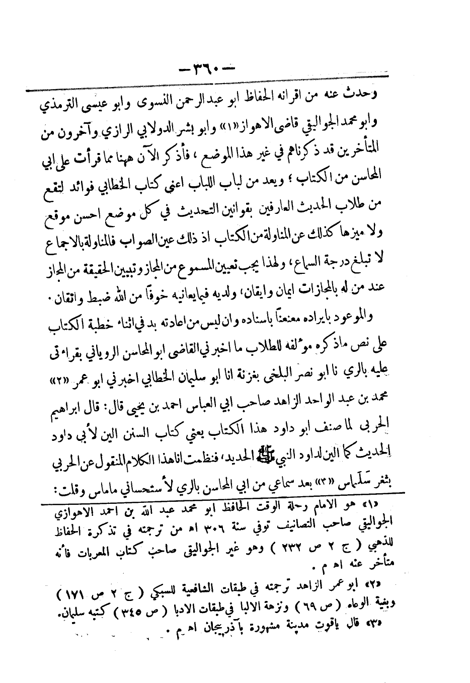 والموعود بإيراده معنعناً بأسناده وإن ليس من إعادته بد في أثناء خطبة الكتاب على نص ما ذكره مؤلفه للطلاب ما أخبرني القاضي أبو المحاسن الروياني بقراءتي عليه بالري نا أبو نصر البلخي بغزنة أنا أبو سليمان الخطابي أخبرني أبو عمر محمد بن عبد الواحد الزاهد صاحب أبي العباس أحمد بن يحيى قال: قال إبراهيم الحربي لما صنف أبو داود هذا الكتاب، يَعني كتاب السنن ألين لأبي داود الحديث كما ألين لداود النبي صلى الله عليه وسلم الحديد، فنظمت أنا هذا الكلام المنقول عن الحربى بثغر سَلَماس بعد سماعي من أبي المحاسن بالري لاستحساني ما ماس وقلت: