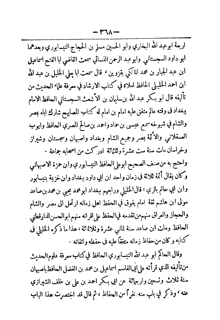 واحتج به من صنف الصحيح أبو علي الحافظ النيسابوري وابن حمزة الأصبهاني وكان يقال أئمة ثلاثة في زمان واحد ابن أبي داود ببغداد وابن خزيمة بنيسابور وابن أبي حاتم بالري، قال الخليلي ورابعهم ببغداد أبو محمد يحيى بن محمد بن صاعد مولى ابن هاشم ثقة إمام يفوق في الحفظ أهل زمانه ارتحل إلى مصر والشام والحجاز والعراق منهم من تقدمه في الحفظ على أقرانه منهم أبو الحسن الدارقطني الحافظ ومات ابن صاعد سنة ثماني عشرة وثلاثمائة، هذا ما ذكره الخليلي في كتابه وكان من حفاط زمانه متفقاً عليه في حفظه وإتقانه.