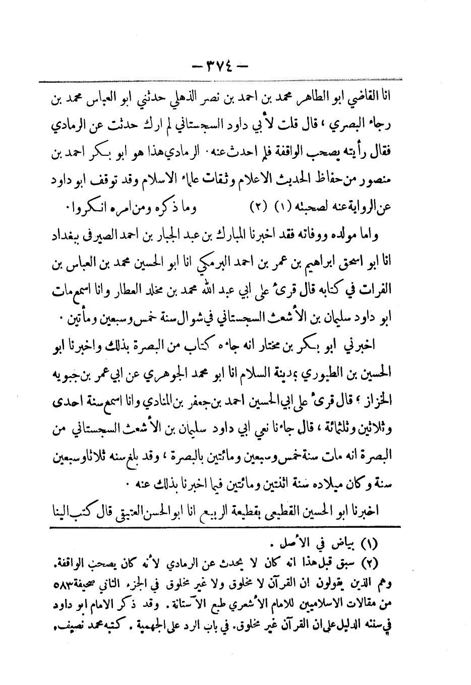 أنا القاضي أبو الطاهر محمد بن أحمد بن نصر الذهلي حدثني أبو العباس محمد بن رجاء البصري، قال قلت لأبي داود السجستاني لم أرك حدثت عن الرمادي فقال رأيته يصحب الواقفة فلم أحدث عنه. الرمادي هذا هو أبو بكر أحمد بن منصور من حفاظ الحديث الاعلام وثقات علماء الإسلام وقد توقف أبو داود عن الرواية عنه لصحبته (¬1) وما ذكره ومن أمره أنكروا.