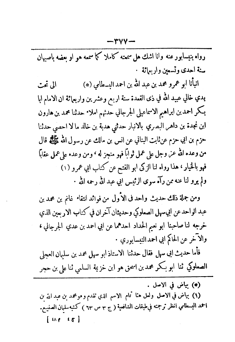 أنبأنا أبو عمرو محمد بن عبد الله بن أحمد البسطامي (¬1) إلى تحت يدي خالي عبيد الله في ذي القعدة سنة أربع وعشرين وأربعمائة أن الإمام أبا بكر أحمد بن إبراهيم الإسماعيلي الجرجاني حدثهم املاء حدثنا محمد بن هارون بن نجدة بن داهر البصري بالأنبار حدثني هدبة بن خالد ما لا أحصي حدثنا حزم بن أبي حزم عن ثابت البناني عن أنس بن مالك عن رسول الله صلى الله عليه وسلم قال من وعده الله عز وجل على عمل ثواباً فهو منجز له، ومن وعده على عمل عقاباً فهو بالخيار، هذا رواه لنا الزكي أبو الفتح عن كتاب أبي عمرو.