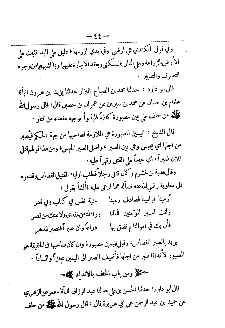 قال أبو داود: حدثنا محمد بن الصباح البزاز حدثنا يزيد بن هارون أنبأنا هشام بن حسان عن محمد بن سيرين عن عمران بن حصين قال: قال رسول الله صلى الله عليه وسلم: من حلف على يمين مصبورة كاذباً فليتبوأ بوجهه مقعده من النار.