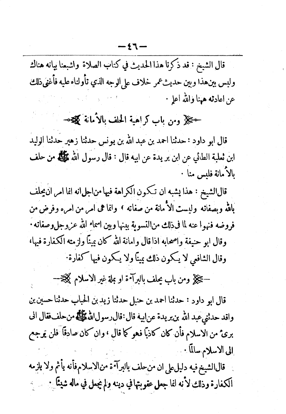 قال أبو داود: حدثنا أحمد بن عبد الله بن يونس حدثنا زهير حدثنا الوليد بن ثعلبة الطائي عن ابن بريدة عن أبيه قال: قال رسول الله صلى الله عليه وسلم: من حلف بالأمانة فليس منا.