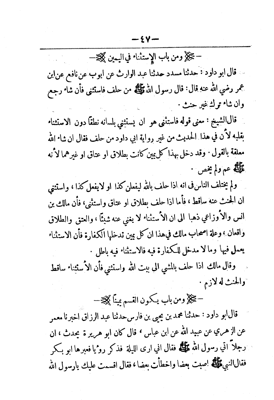 قال أبو داود: حدثنا مسدد حدثنا عبد الوارث عن أيوب عن نافع عن ابن عمر رضي الله عنه قال: قال رسول الله صلى الله عليه وسلم من حلف فاستثنى فإن شاء رجع وإن شاء ترك غير حنث.
