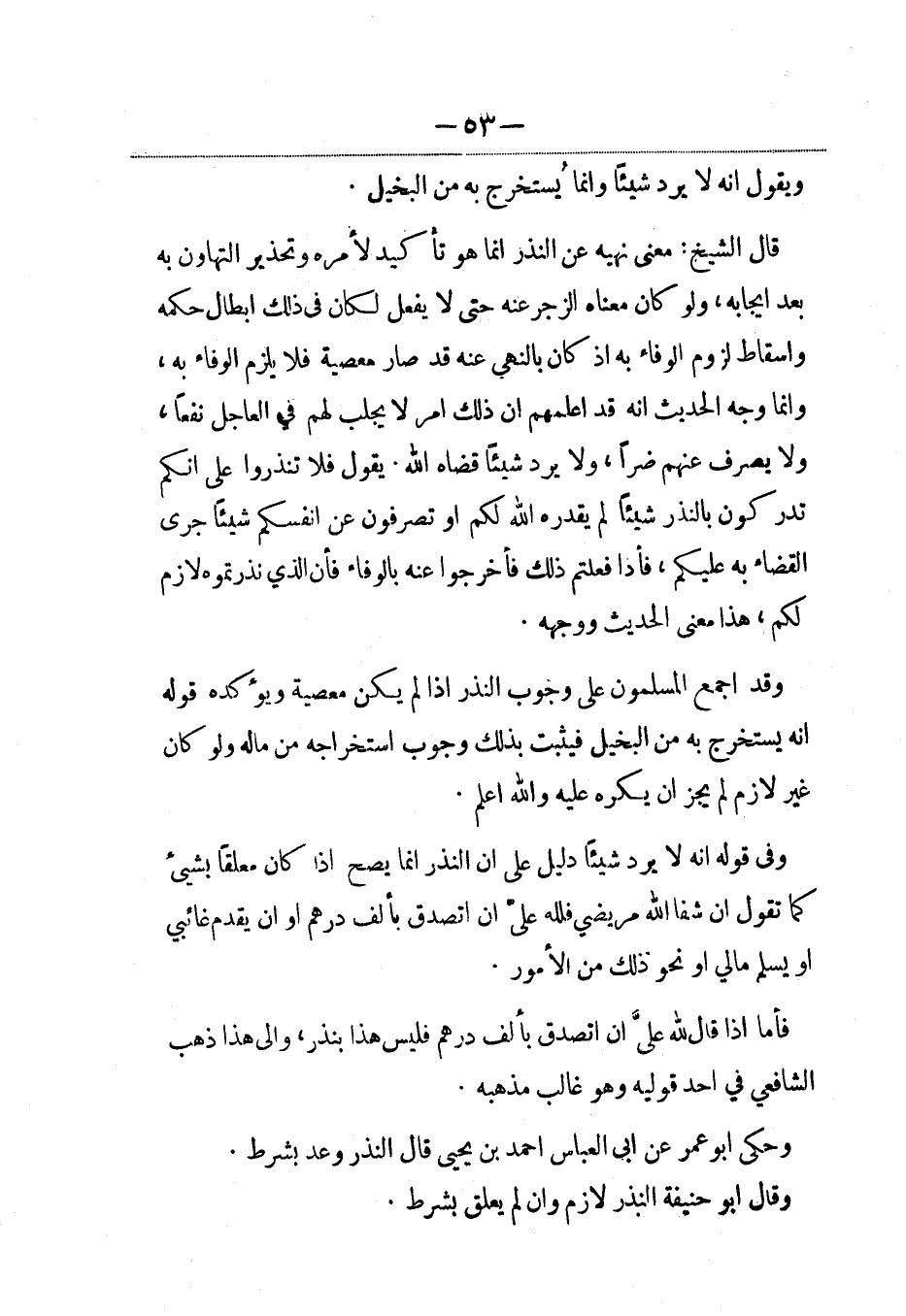 قال الشيخ: معنى نهيه عن النذر إنما هو تأكيد لأمره وتحذير التهاون به بعد إيجابه، ولو كان معناه الزجر عنه حتى لا يفعل لكان في ذلك إبطال حكمه واسقاط لزوم الوفاء به إذ كان بالنهي عنه قد صار معصية فلا يلزم الوفاء به، وإنما وجه الحديث أنه قد أعلمهم أن ذلك أمر لا يجلب لهم في العاجل نفعاً، ولا يصرف عنهم ضراً، ولا يرد شيئاً قضاه الله. يقول فلا تنذروا على أنكم تدركون بالنذر شيئاً لم يقدره الله لكم أو تصرفون عن أنفسكم شيئاً جرى القضاء به عليكم، فإذا فعلتم فاخرجوا عنه بالوفاء فإن الذي نذرتموه لازم لكم، هذا معنى الحديث ووجهه.