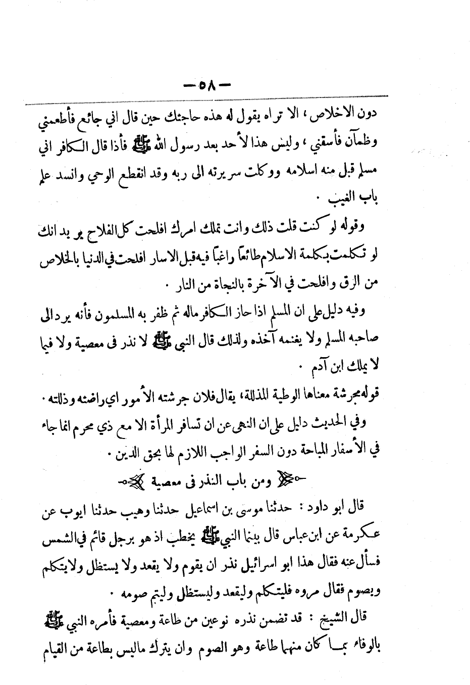قال الشيخ: قد تضمن نذره نوعين من طاعة ومعصية فأمره النبي صلى الله عليه وسلم بالوفاء بما كان منهما طاعة وهو الصوم وأن يترك ما ليس بطاعة من القيام