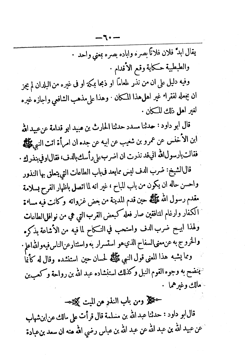 قال أبو داود: حدثنا مسدد حدثنا الحارث بن عبيد أبو قدامة عن عبيد الله بن الأخنس عن عمرو بن شعيب عن أبيه عن جده أن امرأة أتت النبي صلى الله عليه وسلم فقالت يا رسول الله إني قد نذرت أن أضرب على رأسك بالدف، فقال أوفي بنذرك.