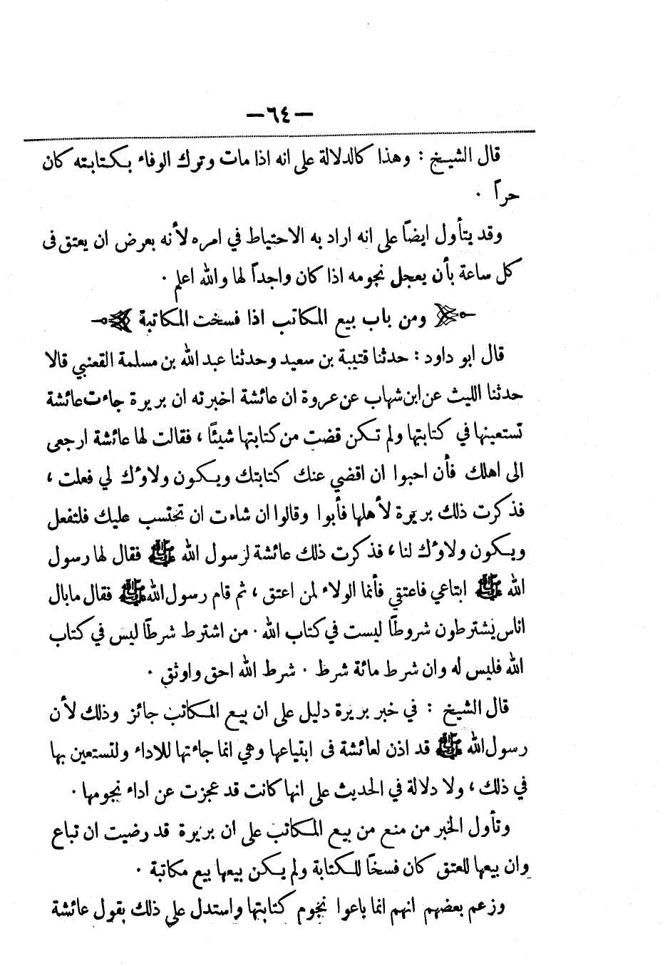 قال أبو داود: حدثنا قتيبة بن سعيد وحدثنا عبد الله بن مسلمة القعنبي قالا: حَدَّثنا الليث عن ابن شهاب عن عروة أن عائشة أخبرته أن بريرة جاءت عائشة تستعينها في كتابتها ولم تكن قضت من كتابتها شيئاً، فقالت لها عائشة ارجعي إلى أهلك فإن أحبوا أن أقضي عنك كتابتك ويكون ولاؤك لي فعلت، فذكرت ذلك بريرة لأهلها فأبوا وقالوا إن شاءت أن تحتسب عليك فلتفعل ويكون ولاؤك لنا، فذكرت ذلك عائشة لرسول الله صلى الله عليه وسلم فقال لها رسول الله صلى الله عليه وسلم ابتاعي فأعتقى فإنما الولاء لمن أعتق، ثم قام رسول الله صلى الله عليه وسلم فقال ما بال أناس يشترطون شروطاً ليست في كتاب الله من اشترط شرطاً ليس في كتاب الله فليس له وإن شرط مائة شرط شرط الله أحق وأوثق.