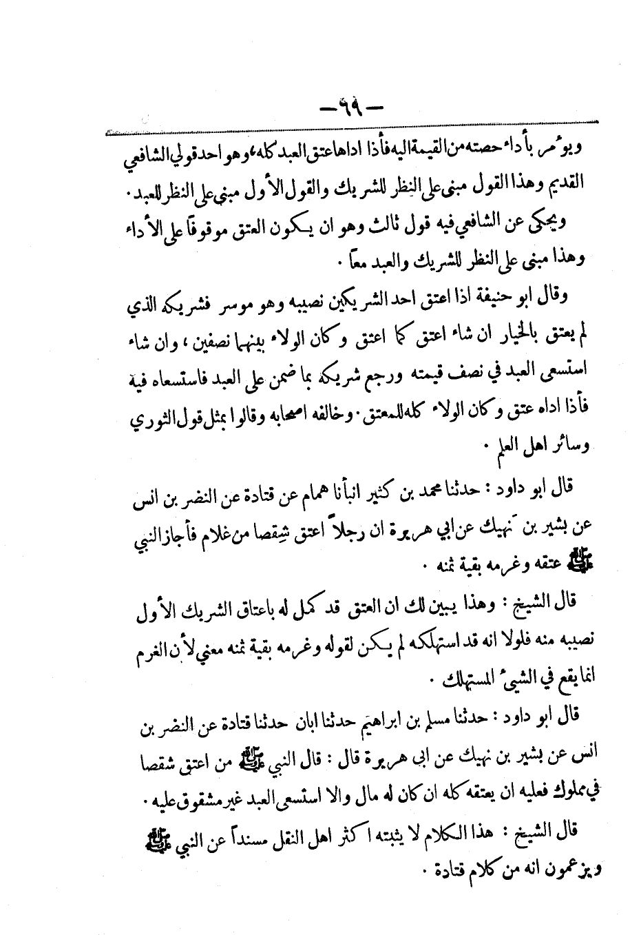 قال أبو داود: حدثنا مسلم بن إبراهيم حدثنا أبان حدثنا قتادة عن النضر بن أنس عن بشير بن نهيك، عَن أبي هريرة قال: قال النبي صلى الله عليه وسلم من أعتق شقصاً في مملوك فعليه أن يعتقه كله إن كان له مال وإلا استسعى العبد غير مشقوق عليه.