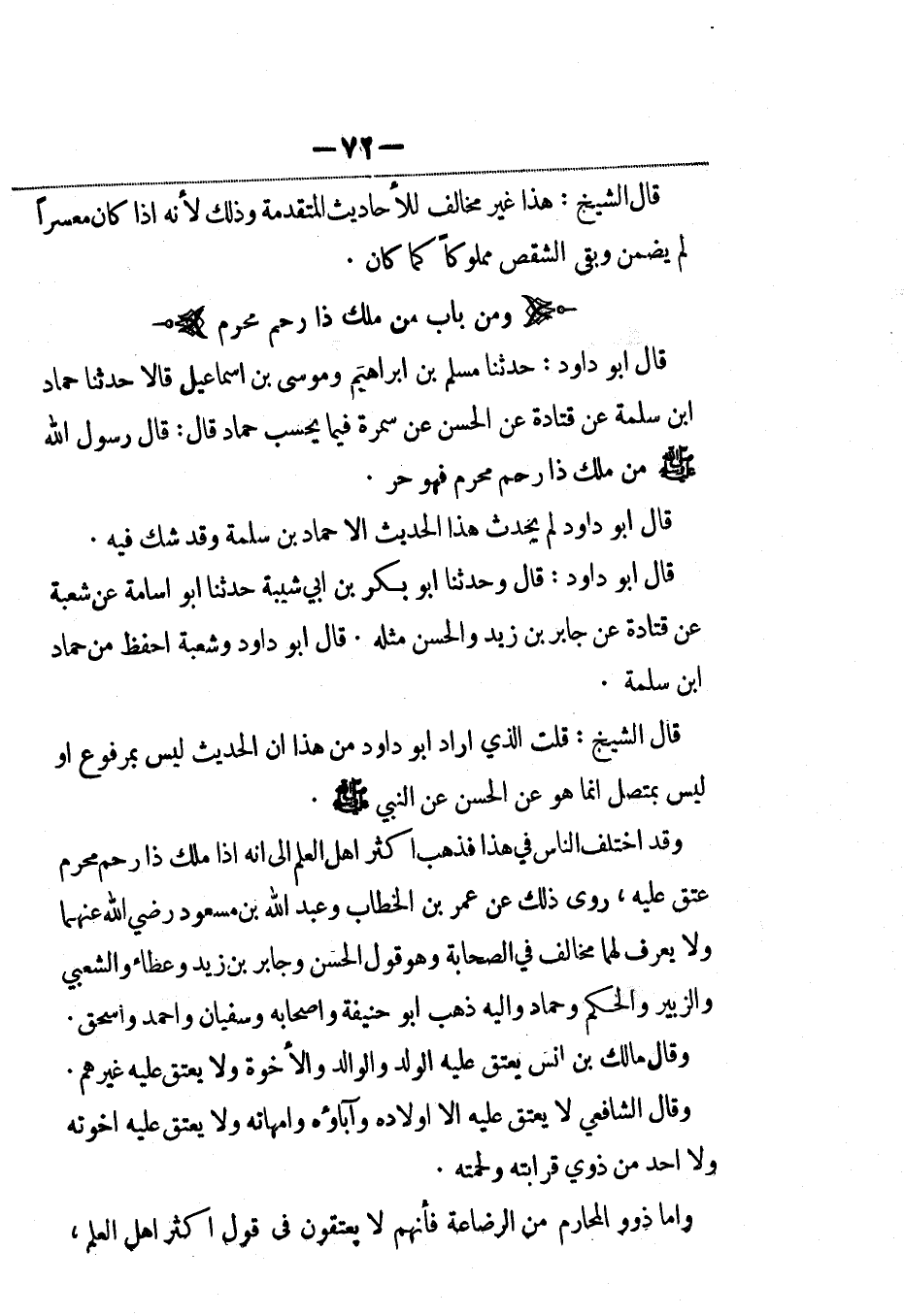 قال أبو داود: حدثنا مسلم بن إبراهيم وموسى بن إسماعيل قالا: حَدَّثنا حماد بن سلمة عن قتادة عن الحسن عن سمرة فيما يحسب حماد قال: قال رسول الله صلى الله عليه وسلم من ملك ذا رحم محرم فهو حر.