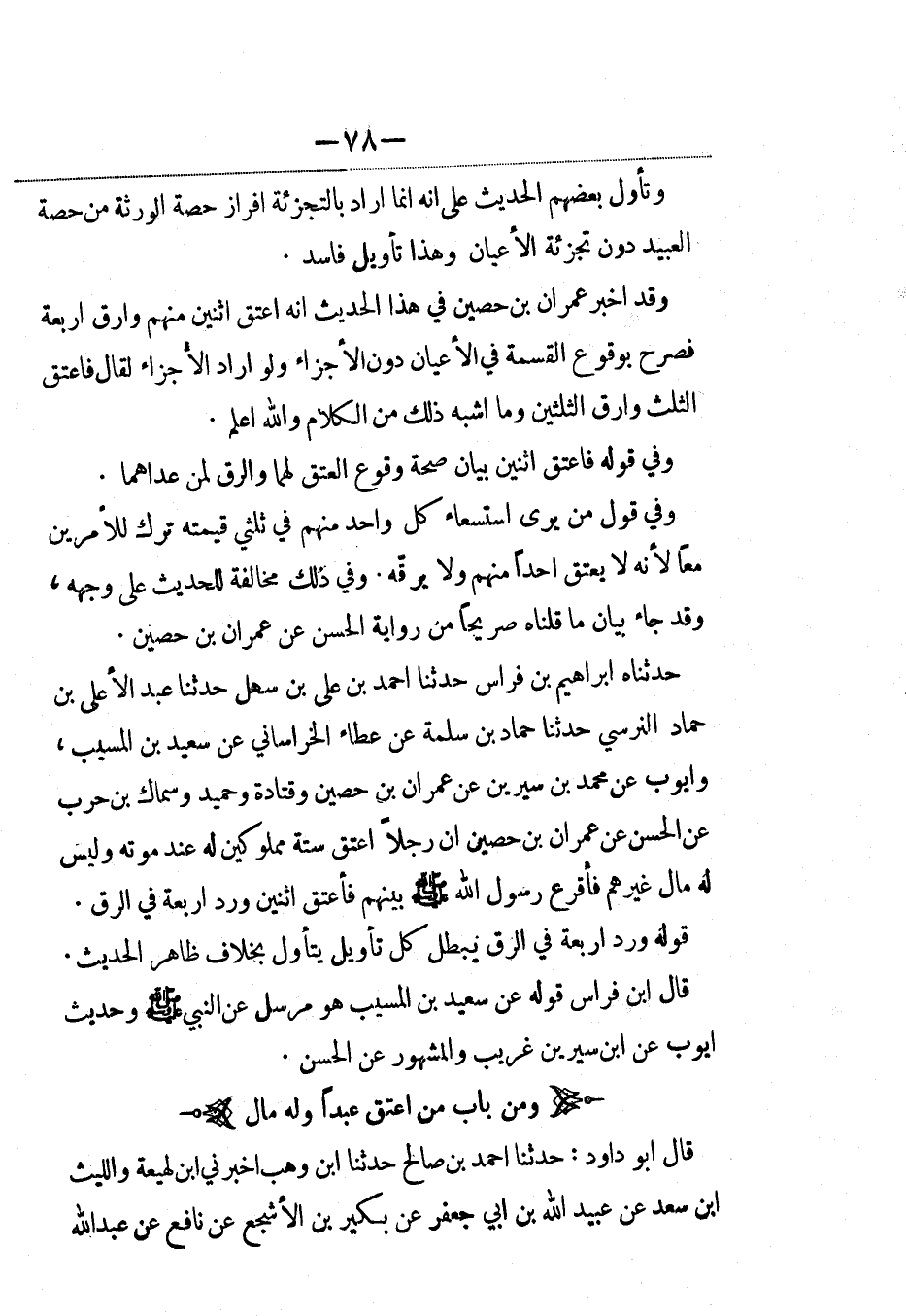 حدثناه إبراهيم بن فراس حدثنا أحمد بن علي بن سهل حدثنا عبد الأعلى بن حماد النرسي حدثنا حماد بن سلمة عن عطاء الخراساني عن سعيد بن المسيب، وأيوب عن محمد بن سيرين عن عمران بن حصين وقتادة وحميد وسماك بن حرب عن الحسن عن عمران بن حصين أن رجلاً أعتق ستة مملوكين له عند موته وليس له مال غيرهم فأقرع رسول الله صلى الله عليه وسلم بينهم فأعتق اثنين ورد أربعة في الرق.