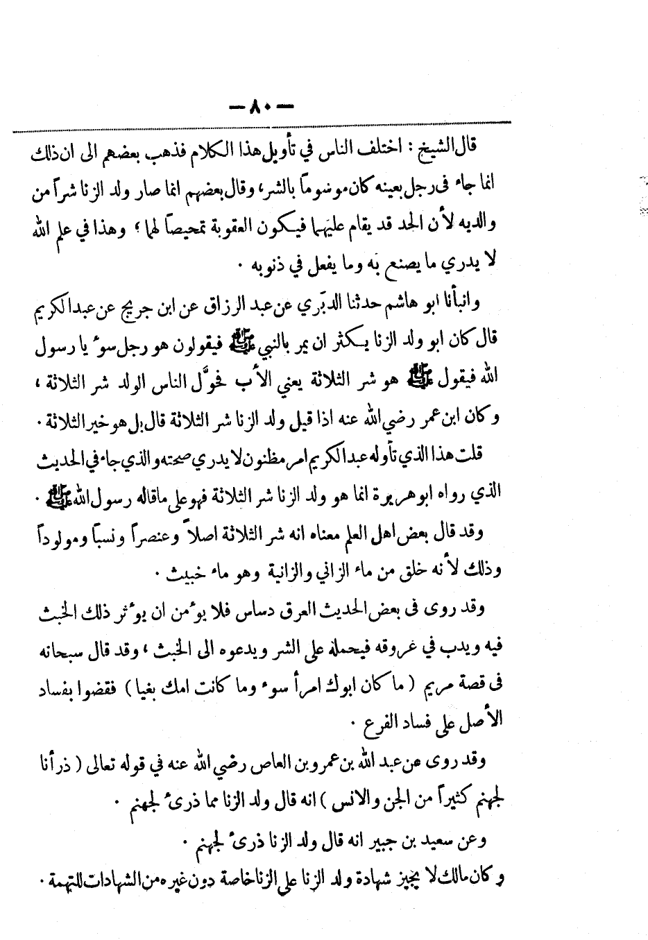وأنبأنا أبو هاشم حدثنا الدبري عن عبد الرزاق عن ابن جريج عن عبد الكريم قال كان أبو ولد الزنا يكثر أن يمر بالنبي صلى الله عليه وسلم فيقولون هو رجل سوء يا رسول الله فيقول صلى الله عليه وسلم: هو شر الثلاثة، يَعني الأب فحول الناس الولد شر الثلاثة، وكان ابن عمر رضي الله عنه إذا قيل ولد الزنا شر الثلاثة قال بل هو خير الثلاث.