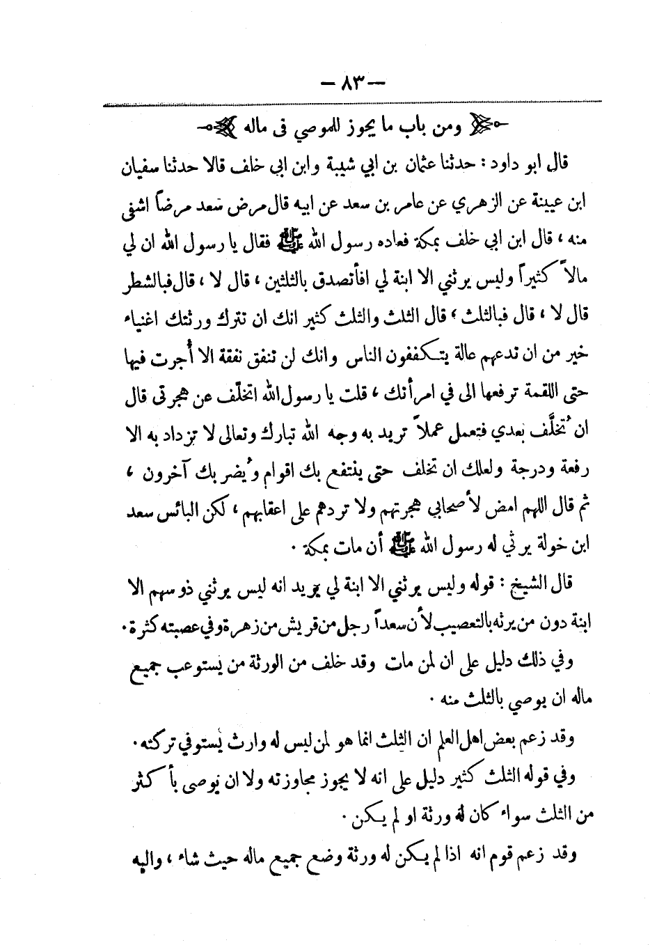 قال أبو داود: حدثنا عثمان بن أبي شيبة وابن أبي خلف قالا: حَدَّثنا سفيان بن عيينة عن الزهري عن عامر بن سعد عن أبيه قال مرض سعد مرضاً اشفى منه، قال ابن أبي خلف بمكة فعاده رسول الله صلى الله عليه وسلم فقال يا رسول الله إن لي مالاً كثيراً وليس يرثني إلاّ ابنة لي أفأتصدق بالثلثين، قال لا، قال فبالشطر قال لا، قال فبالثلث، قال الثلث والثلث كثير إنك إن تترك ورثتك أغنياء خير من أن تدعهم عالة يتكففون الناس وإنك لن تنفق نفقة إلاّ أجرت فيها حتى اللقمة ترفعها إلي في امرأتك، قلت يا رسول الله أتخلّف عن هجرتي قال ان تُخلَّف بعدي فتعمل عملاً تريد به وجه الله تبارك وتعالى لا تزداد به إلاّ رفعة ودرجة ولعلك أن تخلف حتى ينتفع بك أقوام ويُضر بك آخرون، ثم قال اللهم امض لأصحابي هجرتهم ولا تردهم على أعقابهم، لكن البائس سعد بن خولة يرثي له رسول الله صلى الله عليه وسلم أن مات بمكة.