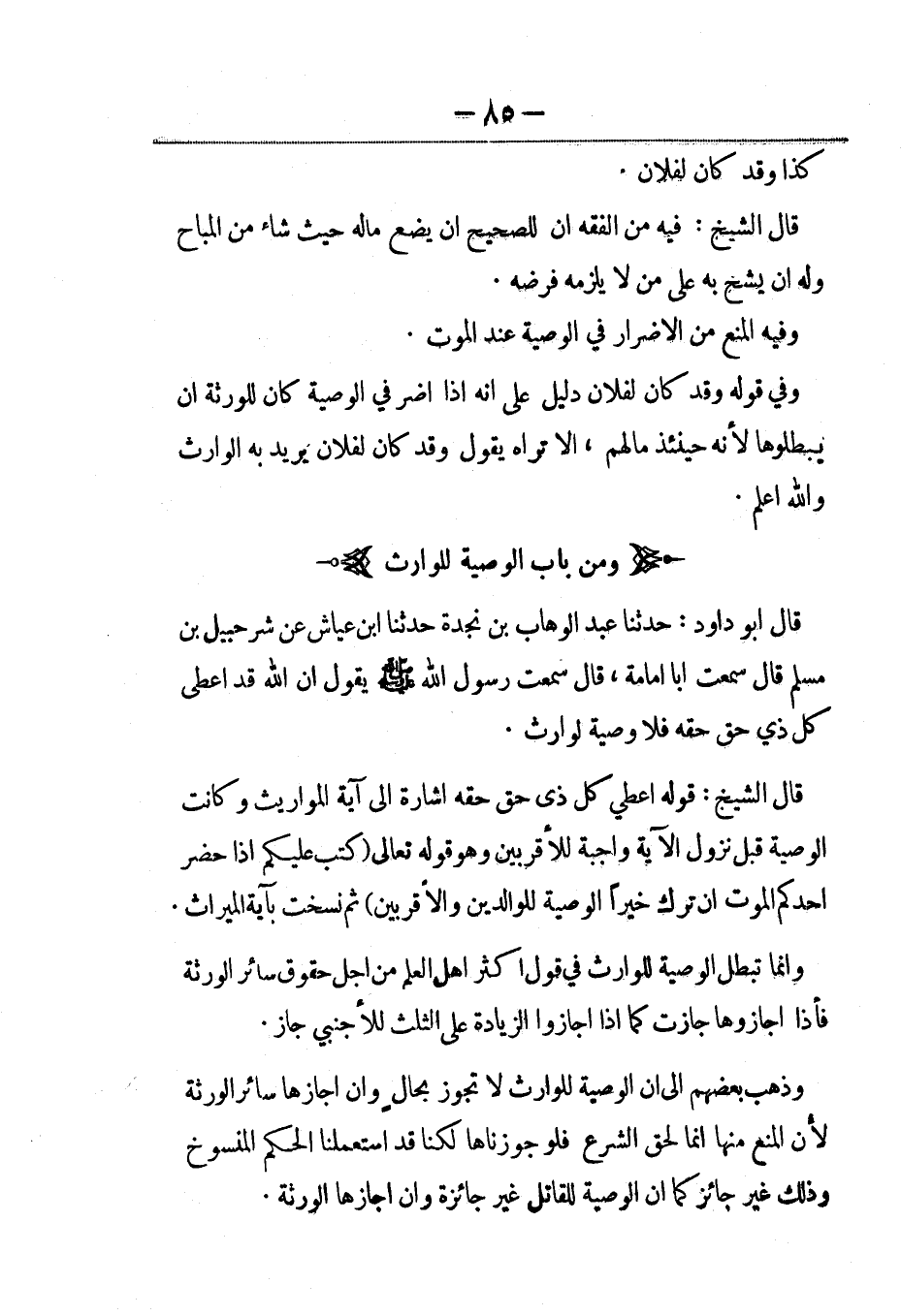 قال أبو داود: حدثنا عبد الوهاب بن نجدة حدثنا ابن عياش عن شرحبيل بن مسلم قال سمعت أبا أمامة، قال سمعت رسول الله صلى الله عليه وسلم يقول: إن الله قد أعطى كل ذي حق حقه فلا وصية لوارث.