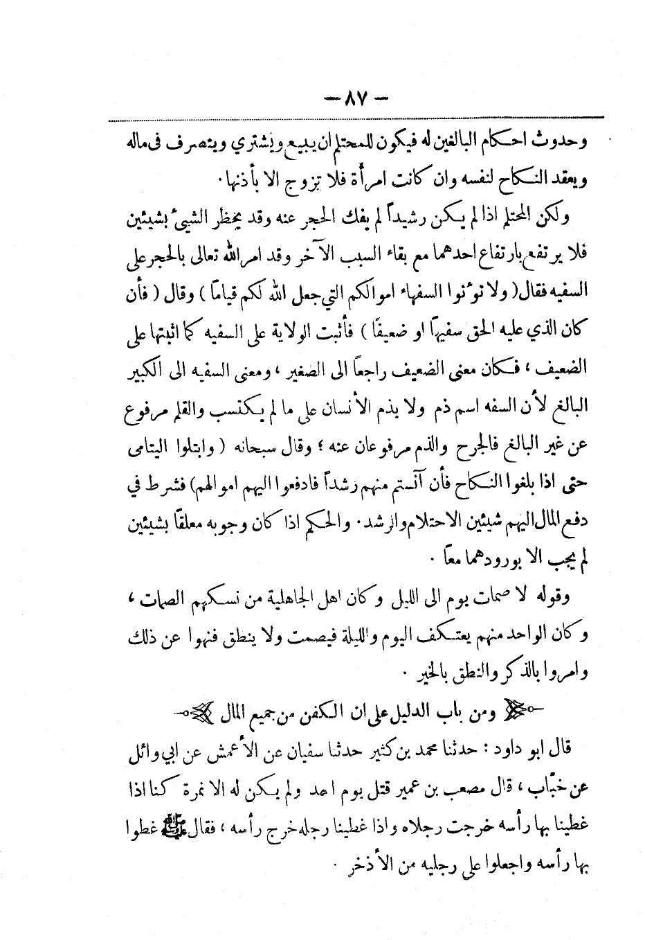ولكن المحتلم إذا لم يكن رشيداً لم يفك الحجر عنه وقد يحظر الشيء بشيئين فلا يرتفع بارتفاع أحدهما مع بقاء السبب الآخر وقد أمر الله تعالى بالحجر على السفيه فقال {ولا تؤتوا السفهاء أموالكم التي جعل الله لكم قياماً} [النساء: 5] وقال {فإن كان الذي عليه الحق سفيهاً أو ضعيفاً} [البقرة: 282] فأثبت الولاية على السفيه كما أثبتها على الضعيف، فكان معنى الضعيف راجعاً إلى الصغير، ومعنى السفيه إلى الكبير البالغ لأن السفه اسم ذم ولا يذم الإنسان على ما لم يكتسب والقلم مرفوع عن غير البالغ فالجرح والذم مرفوعان عنه؛ وقال سبحانه {وابتلوا اليتامى حتى إذا بلغوا النكاح فإن آنستم منهم رشداً فادفعوا إليهم أموالهم} [النساء: 6] فشرط في دفع المال إليهم شيئين الاحتلام والرشد. والحكم إذا كان وجوبه معلقاً بشيئين لم يجب إلاّ بورودهما معاً.