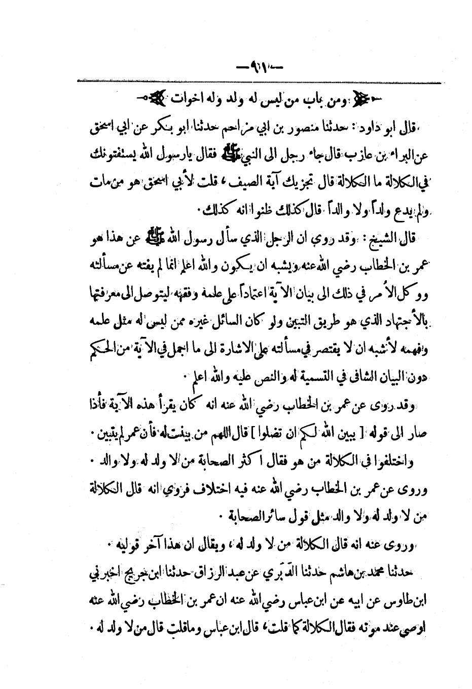 قال أبو داود: حدثنا منصور بن أبي مزاحم حدثنا أبو بكر، عَن أبي إسحاق عن البراء بن عازب قال جاء رجل إلى النبي صلى الله عليه وسلم فقال يا رسول الله يستفتونك في الكلالة ما الكلالة قال تجزيك آية الصيف، قلت لأبي إسحاق هو من مات ولم يدع ولداً ولا والداً قال كذلك ظنوا أنه كذلك.